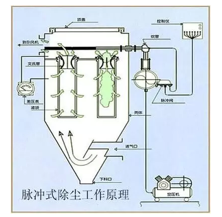 布袋式除塵器是一種干式濾塵裝置。它適用于捕集細小、干燥、非纖維性粉塵。濾袋采用紡織的濾布或非紡織的氈制成,利用纖維織物的過濾作用對含塵氣體進行過濾,當含塵氣體進入袋式除塵器地,顆粒大、比重大的粉塵,由于重力的作用沉降下來,落入灰斗,含有較細小粉塵的氣體在通過濾料時,粉塵被阻留,使氣體得到凈化。