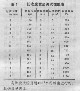 表中工況1的發(fā)塵濃度為188g/m3,過濾速度為2m/min,噴吹壓力為150kPa,脈沖間隔為20秒。這時(shí)除塵器阻力保持在700Pa左右。