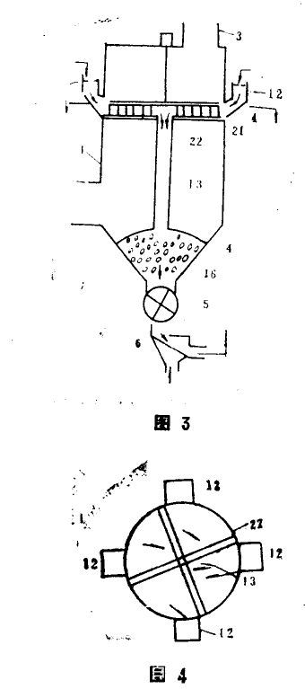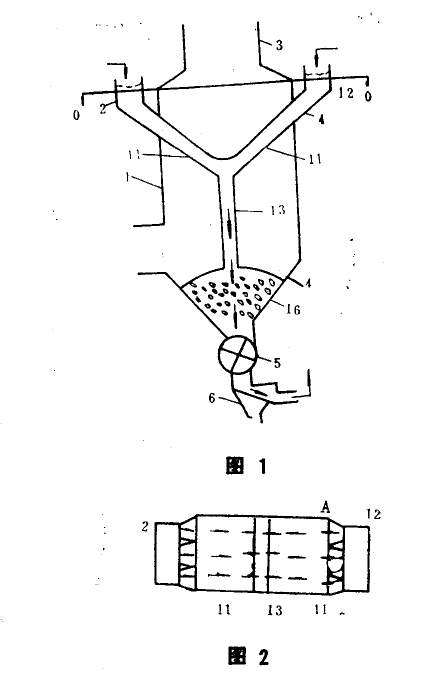 該發明的實例在圖1、圖2中說明.在圖1中,其下部設有廢氣入口2,上部有凈氣出口的集塵室.鍋護與熱交換器等熱回收設備可安裝在出口上方。11為出入口2, 3中間部位。