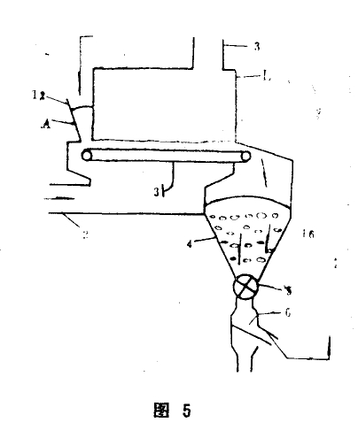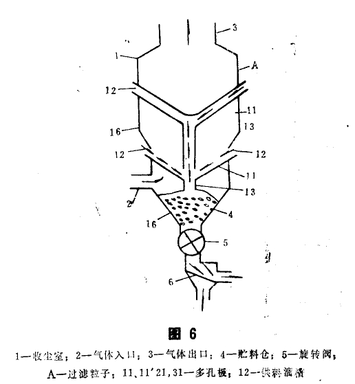 安裝的多孔板,裝置中心成切向旋轉式傾斜,形成從供料溜槽供給的過漣粒子A的移動層.過濾粒子A通常為硅砂,可用于水泥廠熟料除塵。多孔板的傾斜角是過濾粒子的休止角.4為集塵室下部的過濾粒子儲料倉,多孔板上移動的過濾粒子通過下降部分B到儲料倉儲存。在儲料倉4有許多個傳熱管16.從旋轉閥5排出的附有粉塵的過濾粒子由振動篩6將粉塵分離,過濾粒子由圖6示出的傳送裝置輸送到溜槽以供循環使用.
