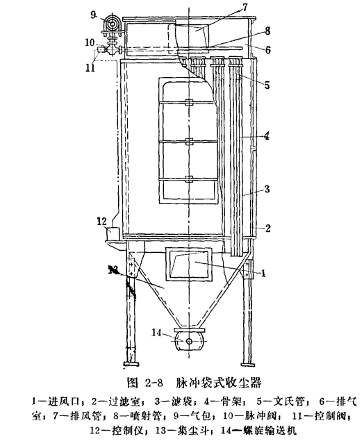 脈沖袋式收塵器是由脈沖噴吹機構—脈沖閥及控制閥、濾袋、排氣室、過濾室、集塵斗、進風管、排氣管、螺旋輸送機等主要部分所組成。它的構造如圖2-8,