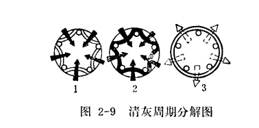 圖2-9為一個清灰周期的分解圖:1為濾袋過濾初期,濾袋表面吸附的扮塵甚少,2為過濾末期,濾袋表面吸附著一層較厚的粉塵,由千氣流通過濾袋向內流動,濾袋呈多角星狀,3為噴吹清灰狀態,氣流反吹,由里向外,濾袋呈圓形,將濾袋表面吸附的粉塵層吹落。