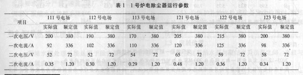 1號爐除塵器運行參數見表1。從表1可知:1號爐除塵器運行參數的實際值與額定值相差甚遠,二次電流的平均合格率僅為16.7%(二次電流合格率為額定電流的40%,即0.48 A )。由此可見除塵器的除塵效率遠遠達不到設計要求。